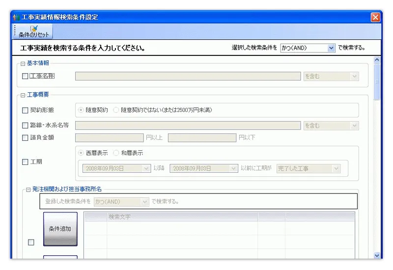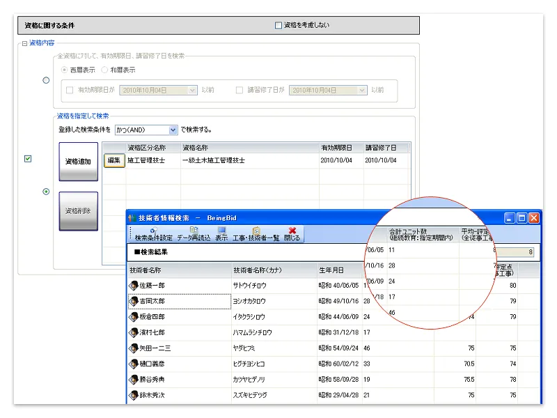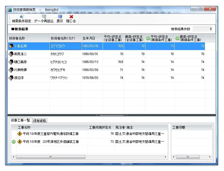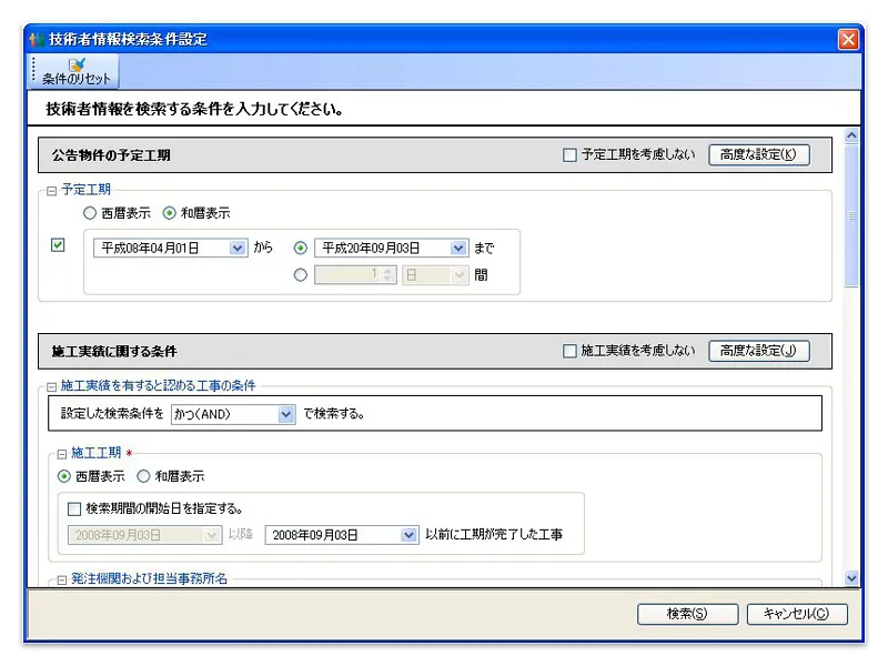 従事工事の技術情報、工事経歴、保有資格、継続教育などを条件に
