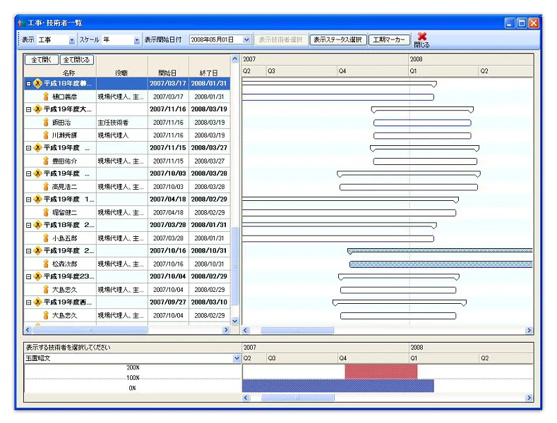 すべての工事・技術者に対して、工期や従事期間をバーチャートで表示します。