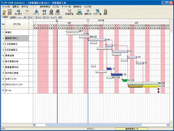 『BeingProject-CCPM』は、全体最適の視点から開発されたプロジェクトマネジメント手法「CCPM(クリティカルチェーン・プロジェクトマネジメント)」に基づいた工程管理を実現できます。「クリティカルチェーン」とは、リソースの競合を考慮して、「それが遅れると全体が遅れる」というタスクをつなげたチェーンのこと。これが施工の「制約条件」であるため、このクリティカルチェーンに注目することで、工期全体の短縮につながります。