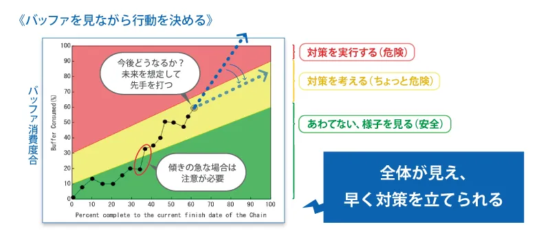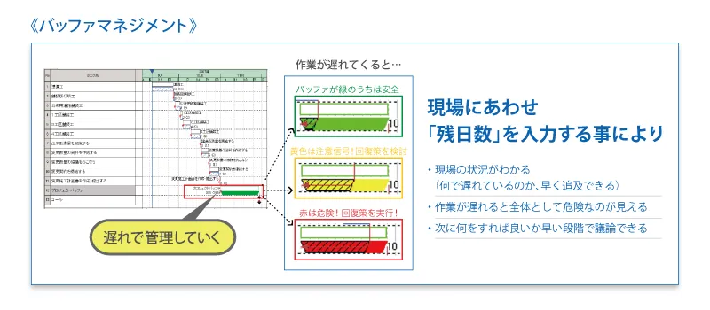 バッファ管理による進捗の見える化 と工期短縮技術 により、関係者間のコミュニケーションを活性化し、無理のない工期遵守を実現します。