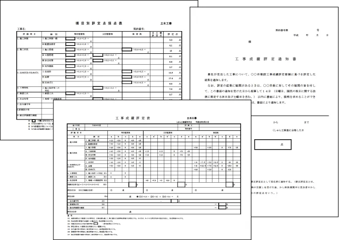「工事成績評定表」や「項目別評定点採点表」、「工事成績評定通知書」など各種帳票をワンクリックで簡単に出力できます。