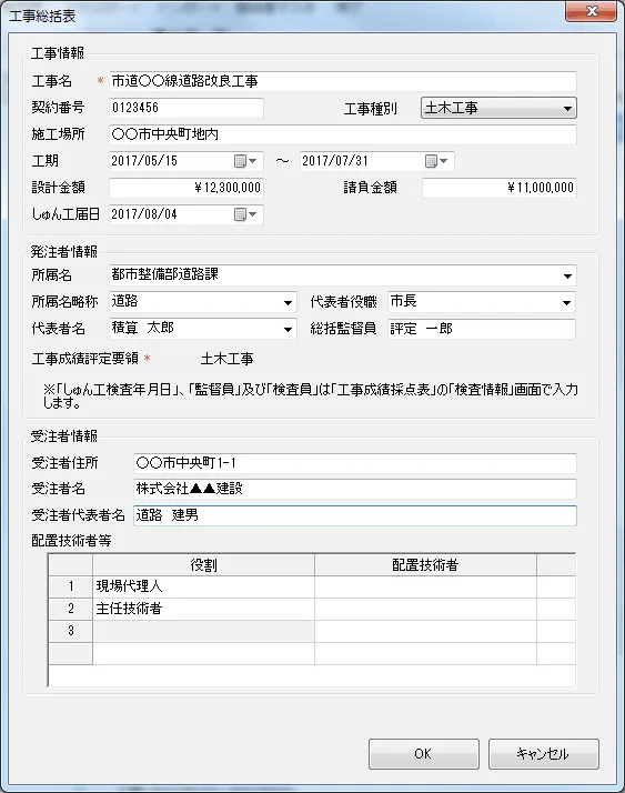 考査する工事の情報を入力する画面です。毎回同じ情報を入力する項目では前回入力した情報を記憶していますので、入力作業を省力化できます。