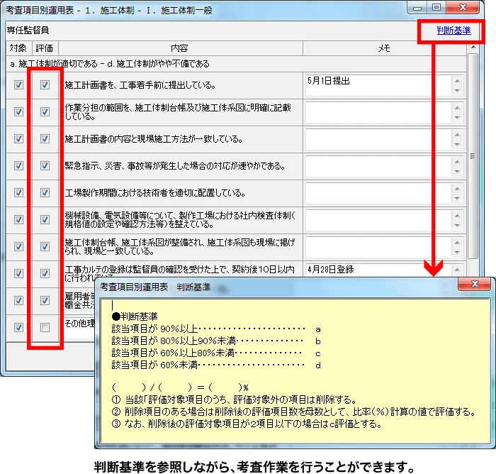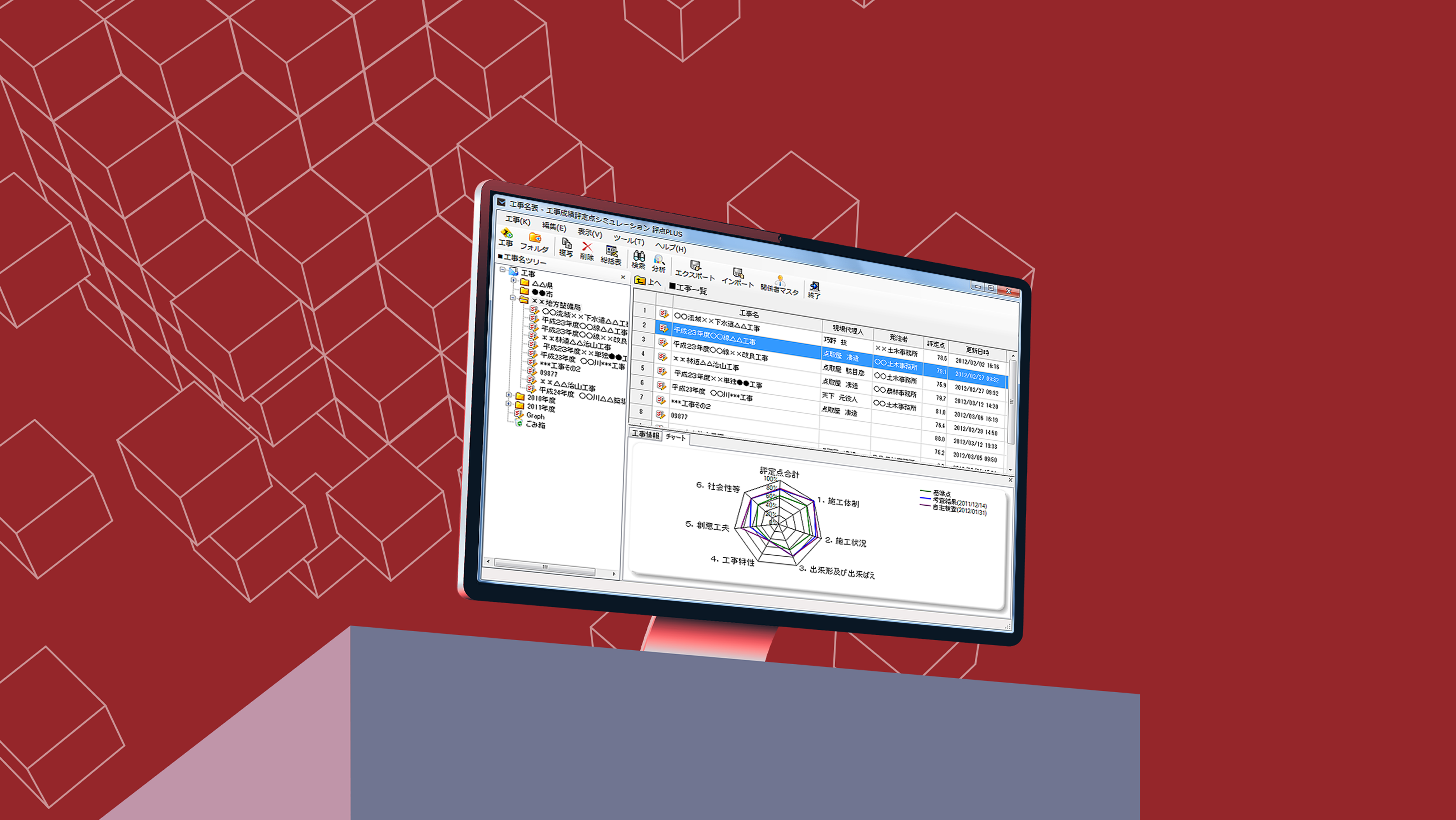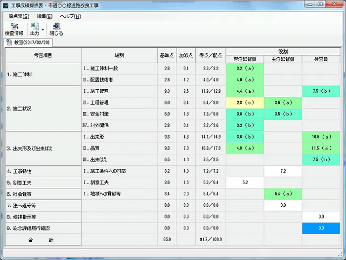 『工事成績評定システム』は、各自治体の基準に準拠した工事成績評定点を算出。評定担当者ごとの採点結果を即時集計し、必要な書類も簡単に作成できます。