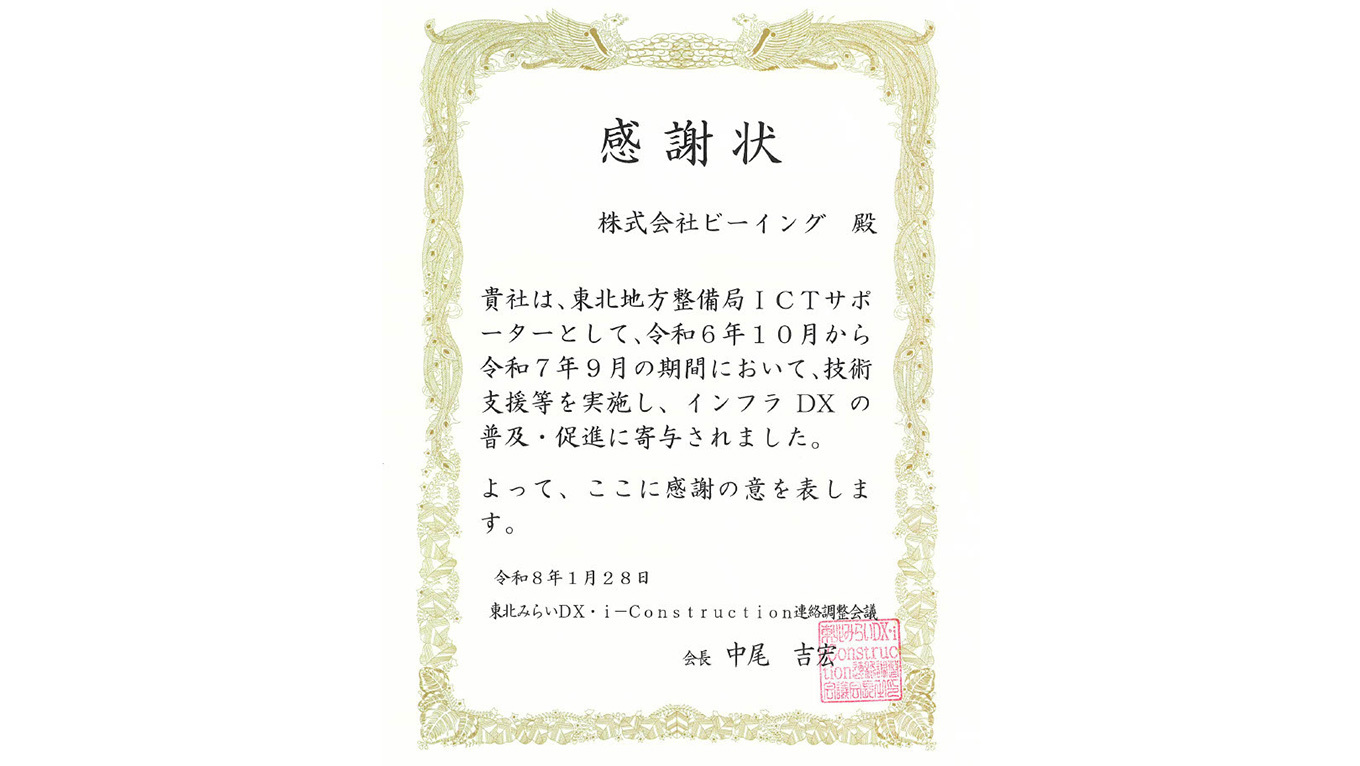 この度、ビーイングは、東北みらいDX・i-Construction連絡調整会議より認定いただいている「ICTサポーター」としての活動に対し、感謝状を贈呈いただきました。
