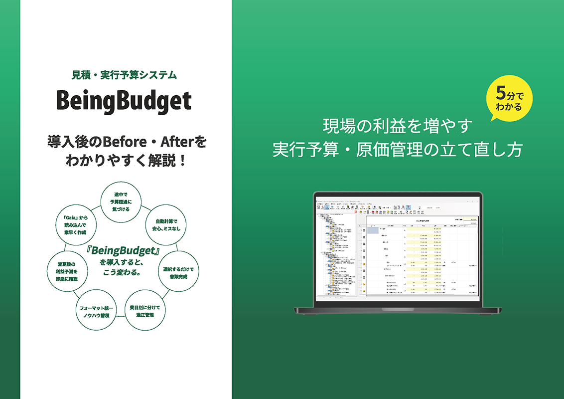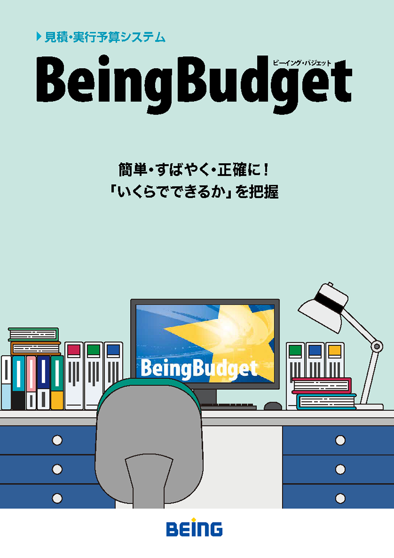 見積・実行予算システム『BeingBudget』(ビーイングバジェット)のパンフレットです。