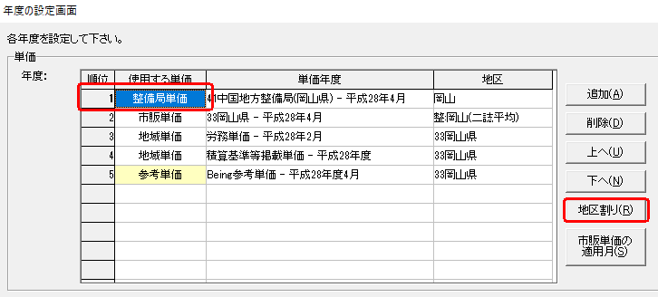 「年度の設定画面」が表示されますので「使用する単価」の 「整備局単価」もしくは「地域単価」の行を選択し、一番右の「地区割り」をクリックして下さい。 PDFの地区割り表が表示されます。