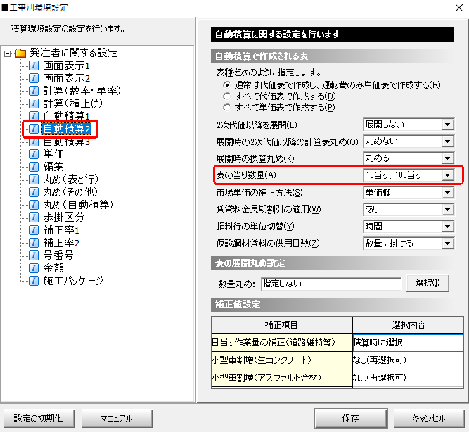 工事別環境設定画面より、「自動積算2」をクリックします。画面右の「表の当り数量」を「日当たり施工量」当り、または「10当り、100当りを選択して「保存」してください。