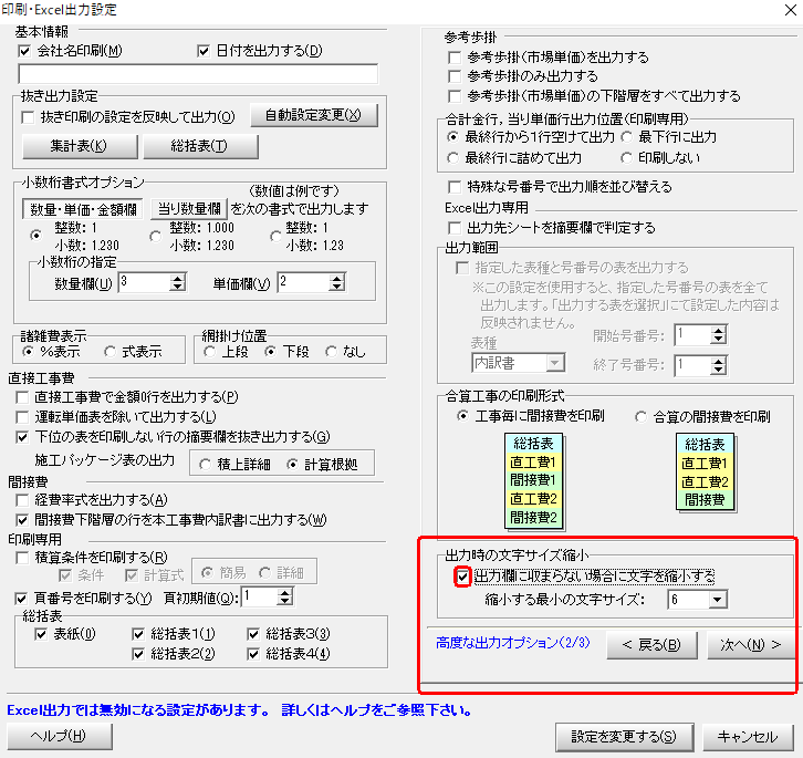「印刷・Excel出力設定」画面が表示されます。画面右下の【印刷設定-高度な出力オプション(2/3)】、「出力時の文字サイズ縮小」の [出力欄に収まらない場合に文字を縮小する]のチェックをいれて文字サイズを選択して下さい。